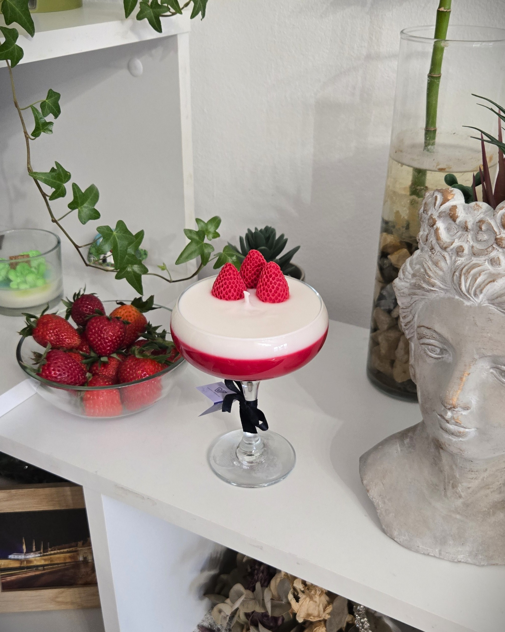 Decorata cu capsuni realiste, aceasta lumanare devine instant un element de decor care atrage atentia si creeaza o atmosfera calda, relaxanta si usor indulgenta.