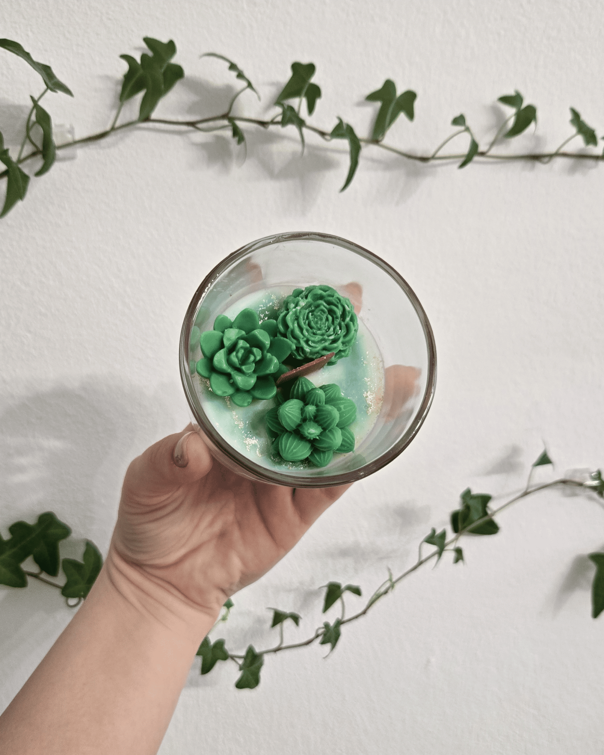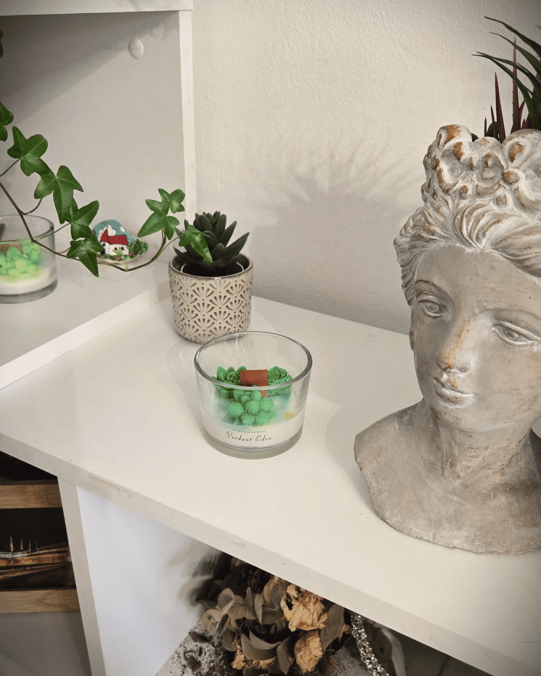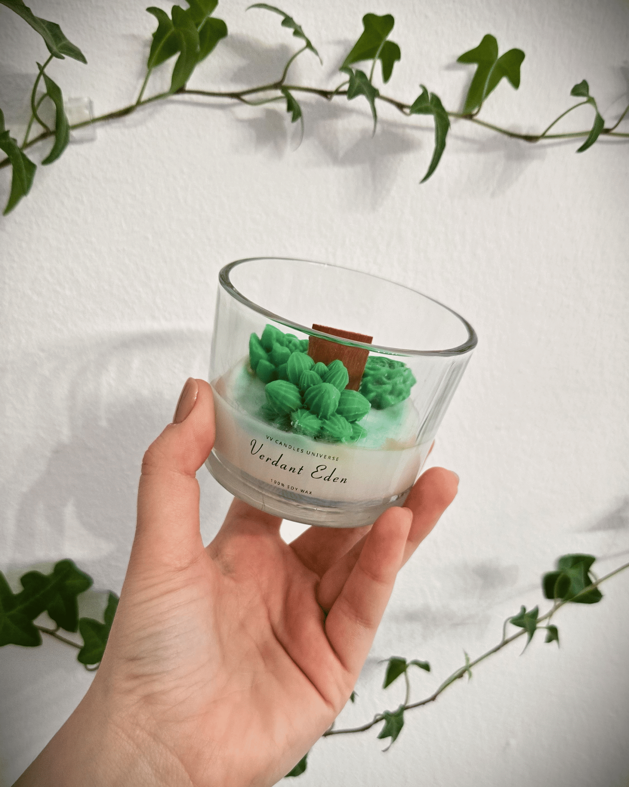 Verdant Eden este o lumanare inspirata din frumusetea naturii, care aduce un colt de liniste si echilibru direct in spatiul tau. Decorata cu suculente realizate manual, fiecare detaliu reda perfect aspectul unor plante reale, transformand produsul intr-un element de decor elegant si relaxant.