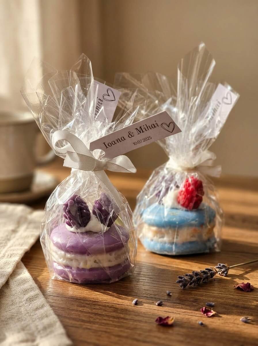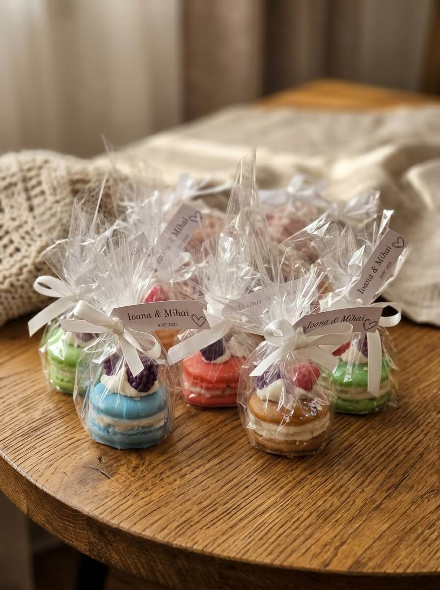 Marturiile Macarons sunt create din ceara, in straturi fine, cu decoruri inspirate din patiseria fina – fructe, creme si accente colorate.